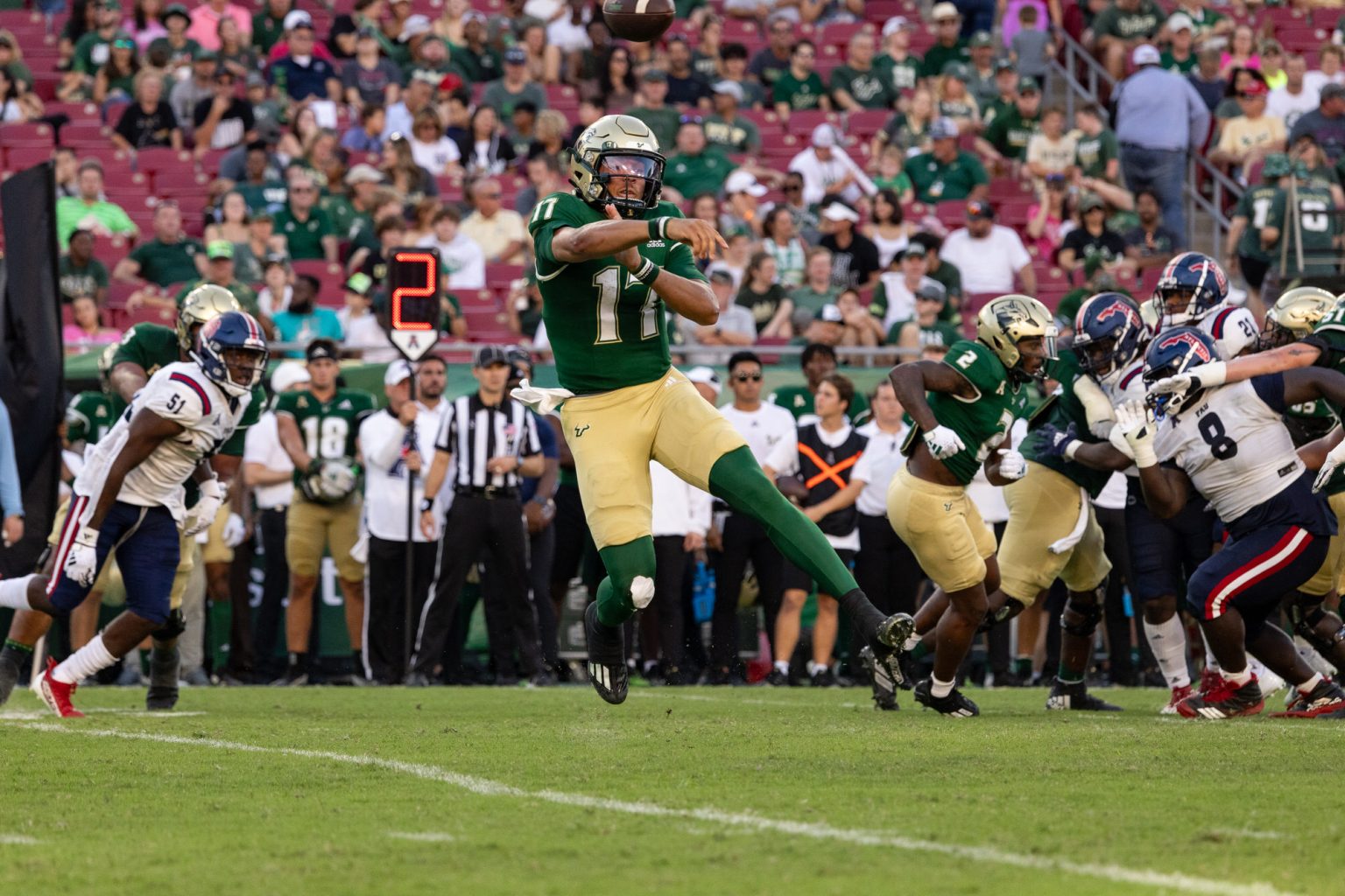 Atkins, the Bulls’ first 1,000-yard receiver, secured six passes for 93 yards and two touchdowns. The Bulls’ offensive prowess propelled them to a 21-0 lead early in the second quarter. Brown’s connection with Atkins and a 31-yard touchdown pass to Khafre Brown highlighted the offensive dominance. John Cannon’s 40-yard field goal further extended the lead to 24-0.