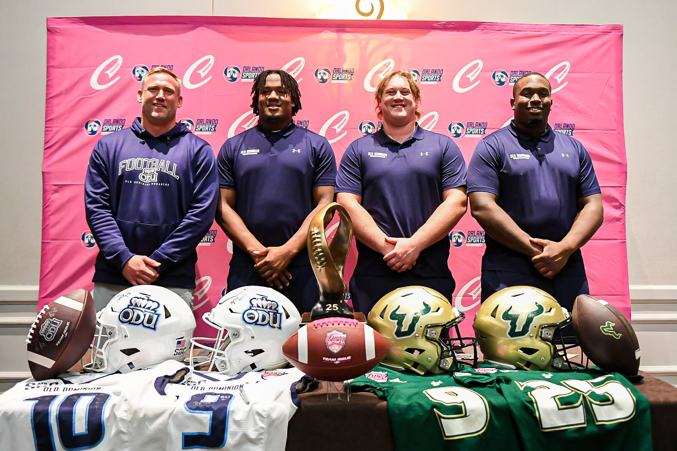 On Monday, the bowl’s deeper mission was front and center at the official press conference, where Orlando Sports Foundation CEO and Cure Bowl Executive Director Alan Gooch honored Old Dominion offensive lineman Stephon Dubose Bourne and South Florida wide receiver Christian Helms with the StaffDNA Cure Bowl Community Service Soldier Medallions. The recognition highlighted service and leadership off the field, a theme echoed throughout the afternoon.