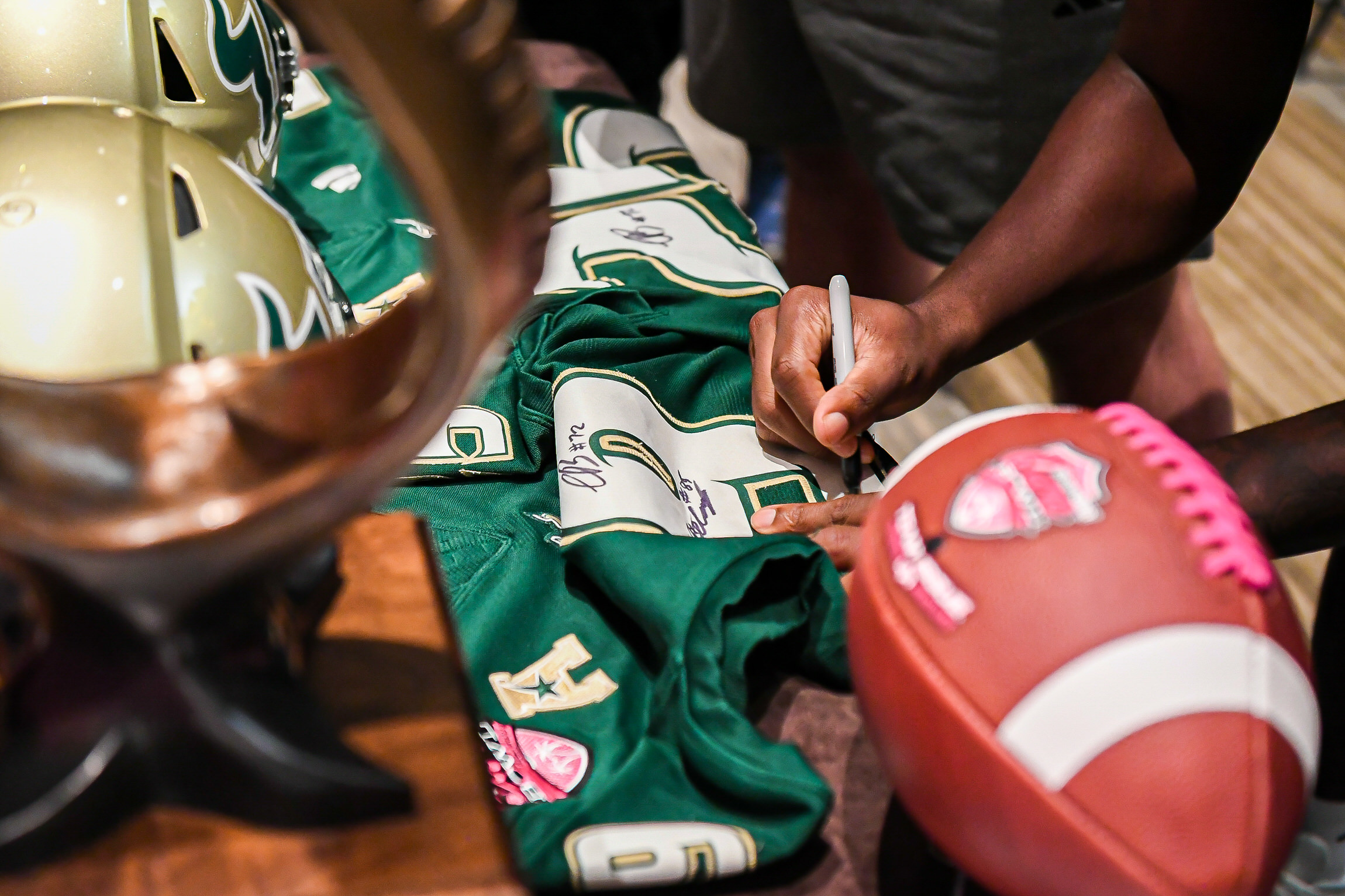 That message resonated with his players. Dubose Bourne shared that he lost his grandmother to breast cancer, while defensive lineman Kris Trinidad spoke about losing his great grandfather to lung cancer. Offensive lineman Zach Barlev explained why the cause has long mattered to him.