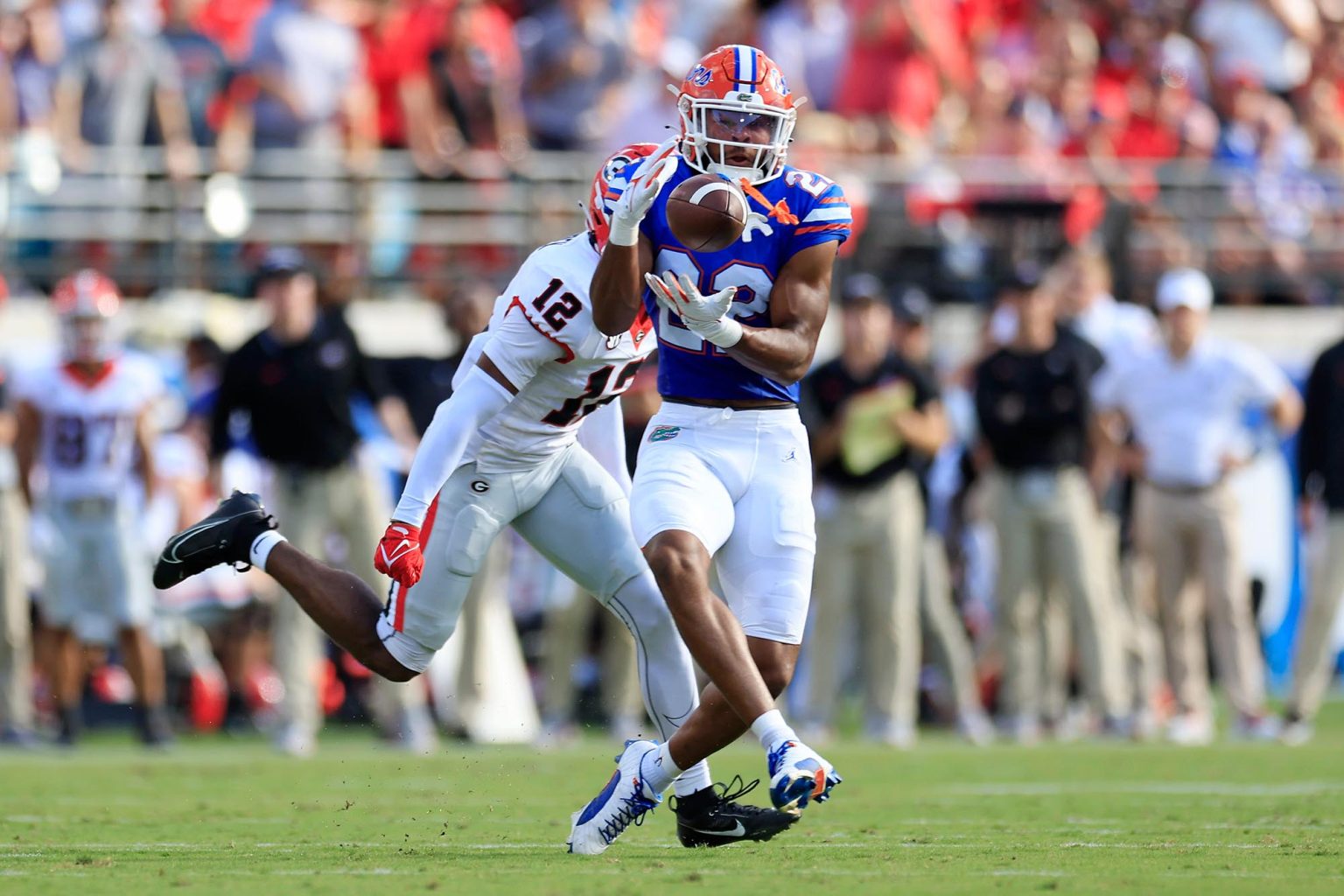 Florida Gators wide receiver Kahleil Jackson (22) hauls in a reception against Georgia Bulldogs defensive back Julian Humphrey (12) during the first quarter of an NCAA Football game Saturday, Oct. 28, 2023 at EverBank Stadium in Jacksonville, Fla. Georgia defeated Florida 43-20. [Corey Perrine/Florida Times-Union]